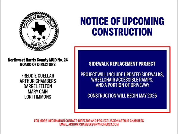 A public hearing for Northwest Harris County Municipal Utility District #24 to discuss the proposed tax rate for the 2025 tax year will be held on Tuesday, November 11, 2025 at 6:00 p.m. The hearing will take place at the District’s Administration Building, 14448 Hollister St., Houston, Texas 77066.